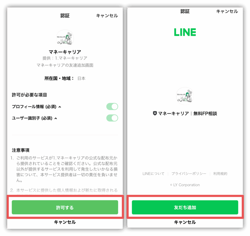 LINEアプリが開いて、マネーキャリアの公式LINEが表示されたら「許可する」→「友だち追加」の順でタップしてね!
