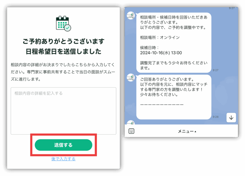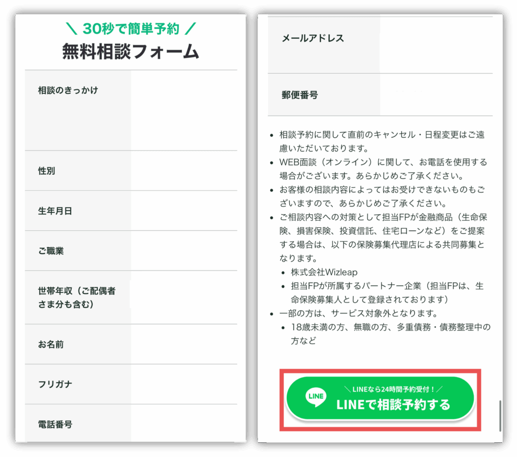 ここまでの入力内容が表示されるから、間違いがないか確認したら「LINEで相談予約する」をタップしよう!