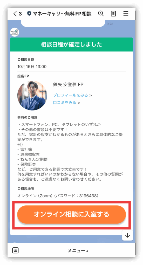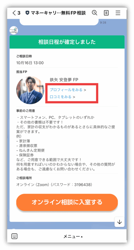 相談の日時が決まると、担当FPさんのプロフィールが送られてくるよ。