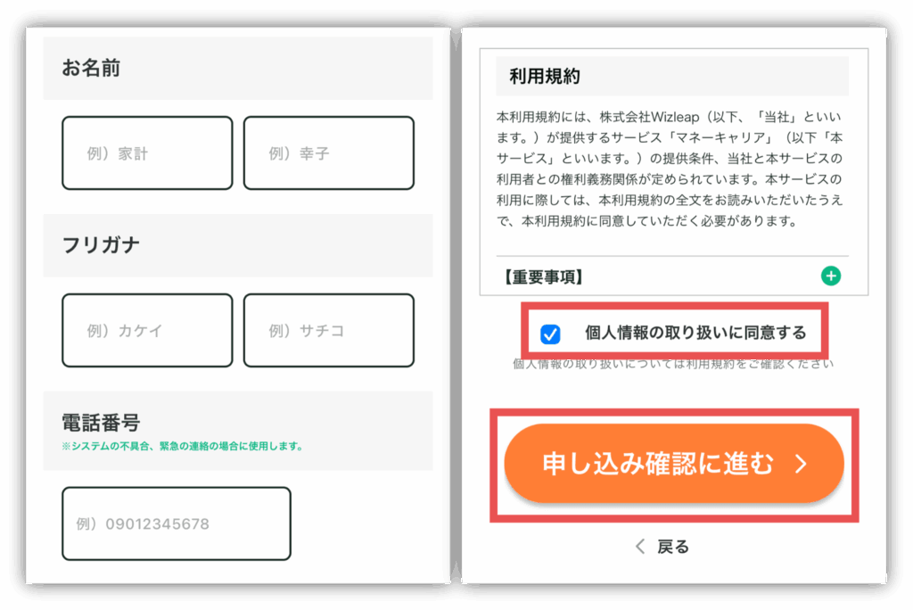 利用規約を確認して「個人情報の取り扱いに同意する」にチェックを入れたら「申し込み確認に進む」をタップ✨