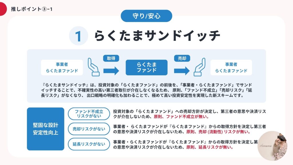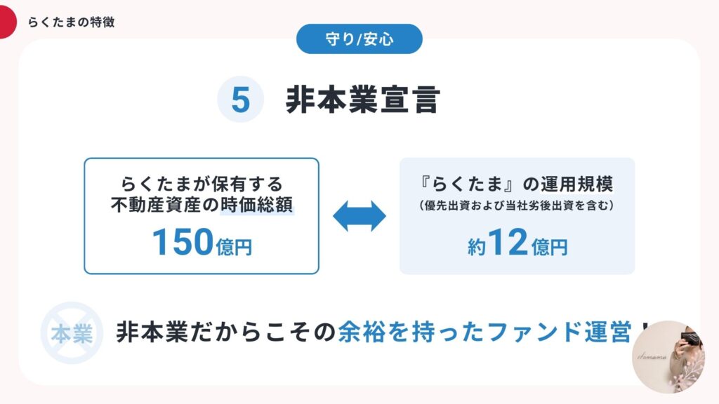 これは何を言ってるかというと、要はこのらくたまを運営する母体の事業が好調で会社として潤沢な資金があるので、らくたまのなかで万が一のことが起きた時でも確実に投資家にお金を戻せる資金を用意してますよ、ということ!