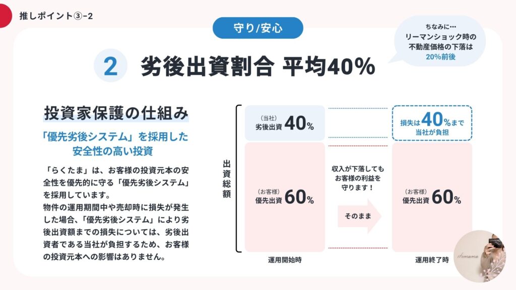 ・万が一損失が出ても33%まではらくたまが損失を請け負ってくれる - アップサイド配当あり!