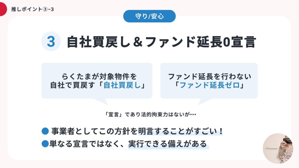 万が一の時でも、らくたまが自社で物件を買い戻すことで「ファンドの延長は起こさない!」と宣言。