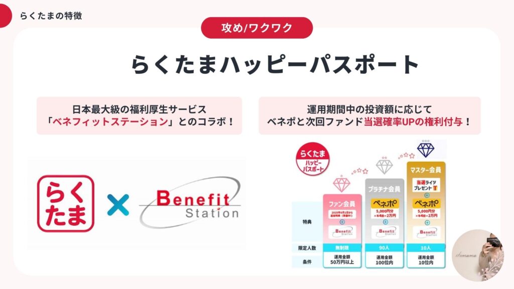 らくたまの会員ランク制度に連動していて、50万円以上まとめて投資するとベネフィット・ステーション(ベネステ)という日本最大級の福利厚生サービスが使い放題になる特典がついてるよ!