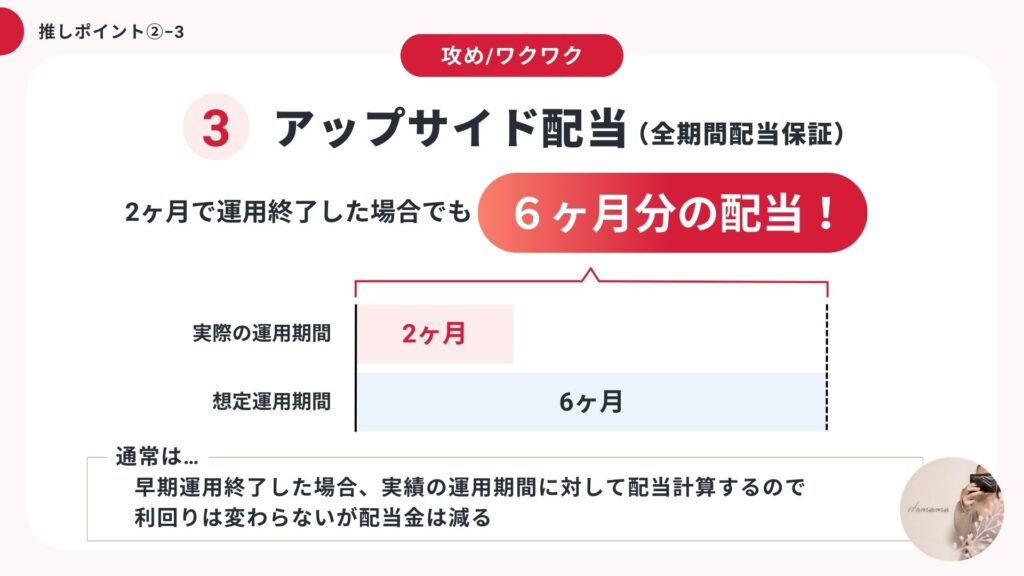 運用期間は1年だけどアップサイド配当採用👏なので、早期終了しても当初の想定から配当が減らない嬉しい案件だね!!