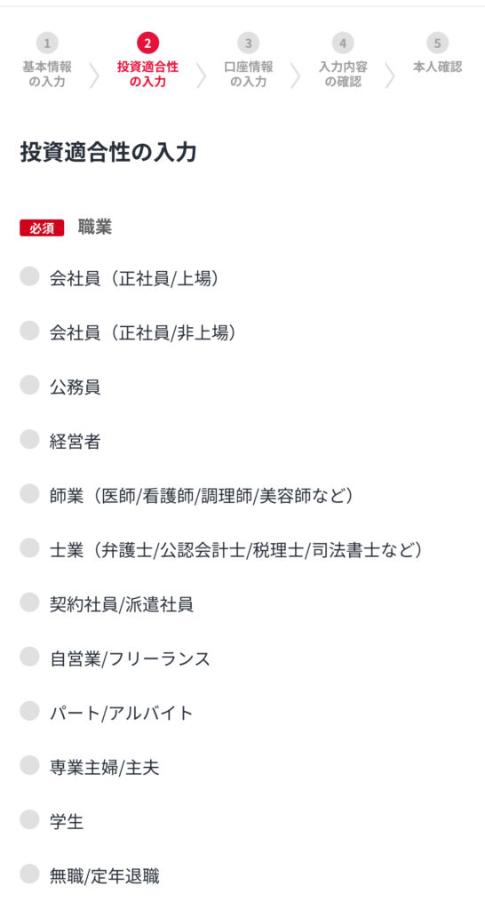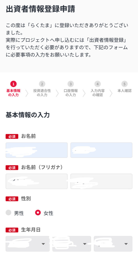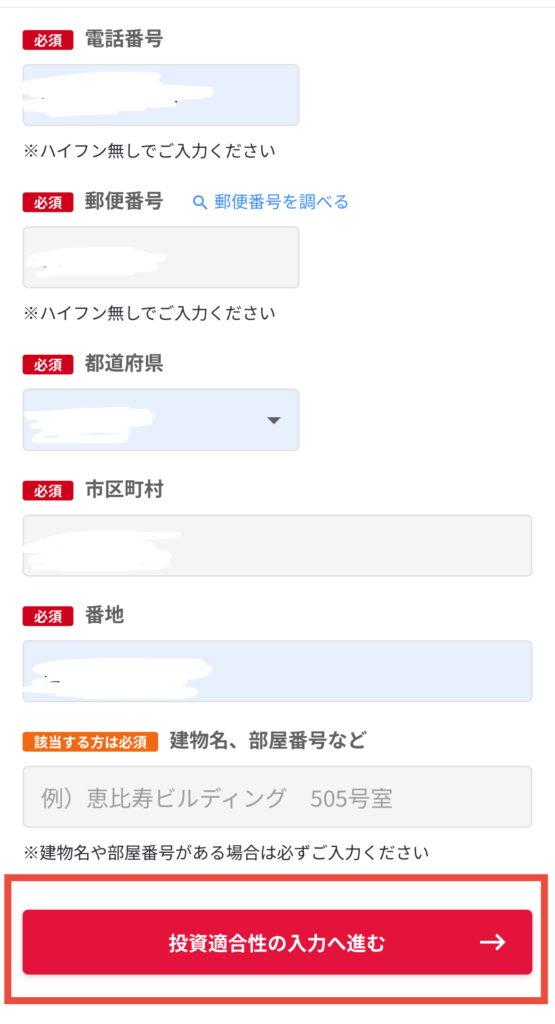 名前や住所など貴保情報を入力して「投資適合性」へ進もう