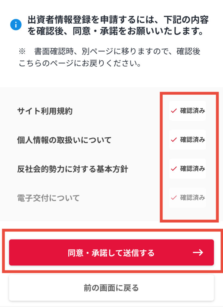 口座情報の入力が終わったら利用規約などをすべて目を通して「同意・承諾して送信する」を押してね。