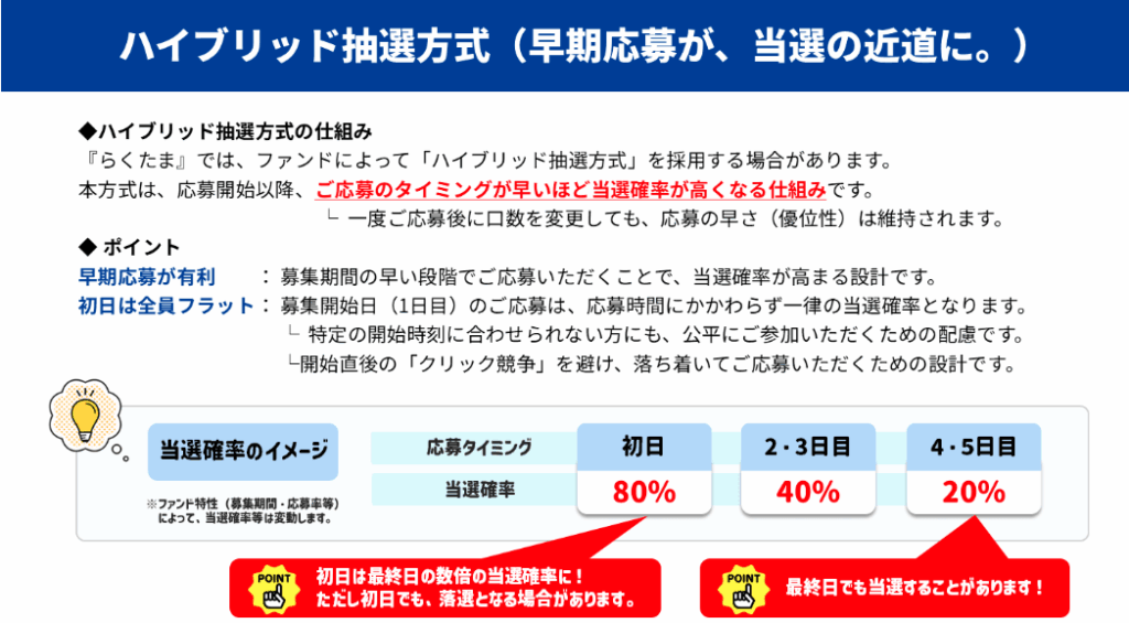 本ファンドは「ハイブリッド抽選方式」を採用していて、早く応募するほど当選確率が高くなる仕組みになっている!