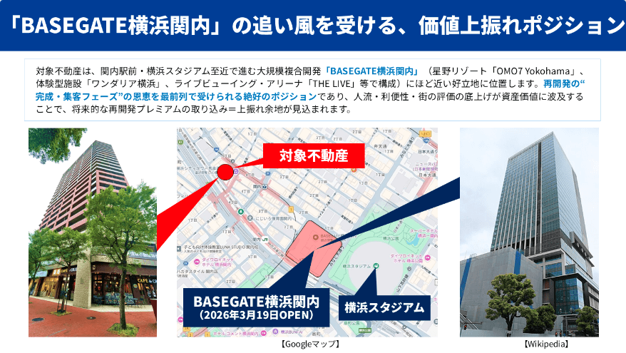 この物件は、大規模な複合開発「BASEGATE横浜関内」に近くて、再開発の恩恵を受けられるから、将来的な価値の上昇が期待できる☺️