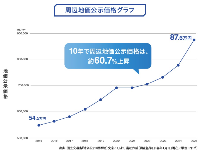 実際に本物件の周辺の地価は、10年で1.6倍以上に上昇中!